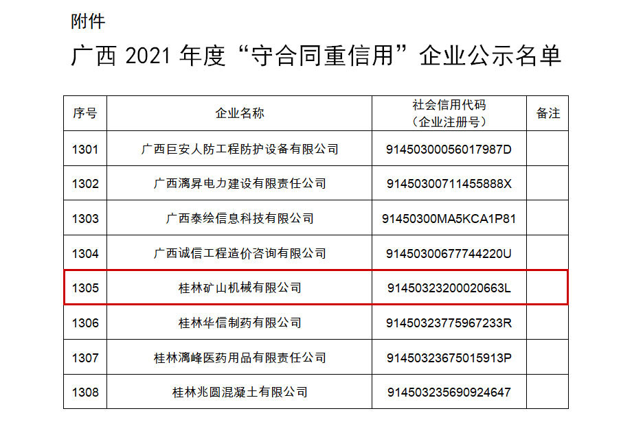 喜報(bào)!桂林礦(kuang)機榮獲(huo)2021年度“守(shǒu)合同 重(zhong)信用”企(qi)業稱号(hao)