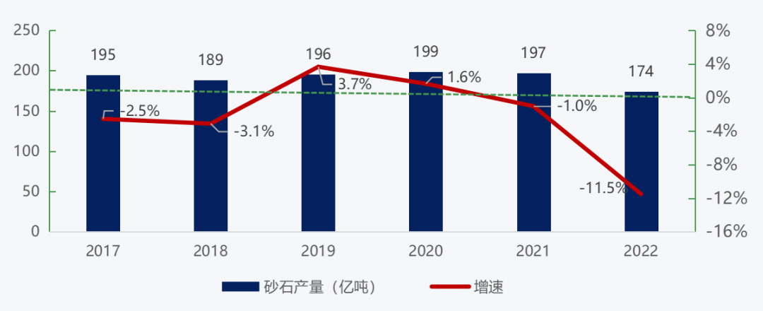 2017-2022年我國砂石(shi)産量變化情(qíng)況