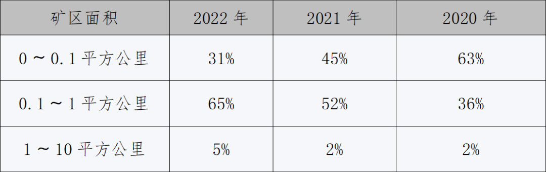 從(cong)新設砂石礦(kuang)權礦區面積(jī)來看,砂石行(háng)業規模化水(shui)平進一步提(ti)升,礦區面積(ji)0.1~1平方公裏之(zhī)間砂石礦權(quán)占💁新設砂石(shí)礦權六成以(yi)上,成爲新設(she)礦權的主流(liu)。新設砂石礦(kuàng)🔴權中,礦區面(mian)積在0~0.1平方公(gong)裏之間的有(you)222宗,占比爲31%,占(zhan)比較2021年下降(jiàng)14個百分點,新(xin)設小規模💰砂(sha)石礦權數量(liàng)持續減少;礦(kuang)區面積在0.1~1平(ping)方公裏之間(jiān)的新設砂石(shi)礦權有464宗,占(zhan)比逐年提升(shēng),2022年已經達到(dao)65%;礦區面積在(zai)1~10平方公裏之(zhī)間的新設砂(sha)石礦權33宗,占(zhan)比爲5%。